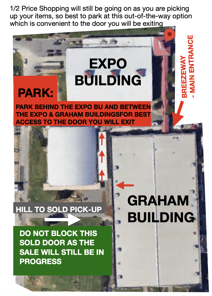 - Items must be checked out. Please collect your items and come to the Large Items area for checkout. You will exit the side red doors (near the SOLD large items pick up area). We recommend that you park between the Graham Building and the Expo Building or behind the Expo Building to try an avoid the heavy parking for those shopping our 1/2 price sale at the same time as optional Seller pick-up. Please see attached map showing this parking area.
